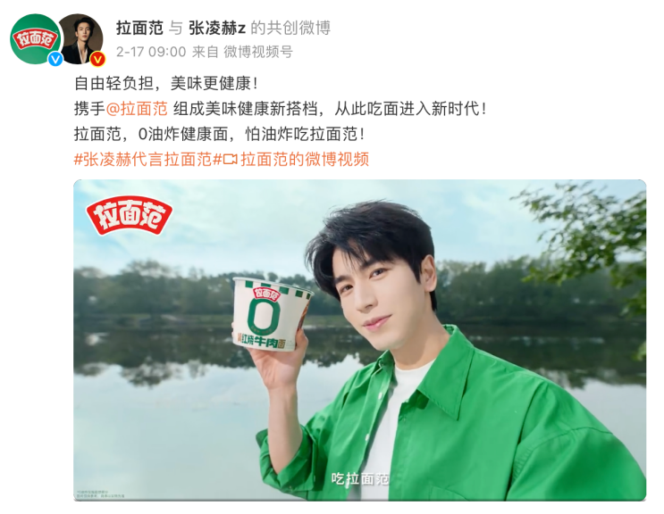拉面范作为国内“0油炸健康面品类开创者”,以让全体国民吃上更健康的速食面为初心,从中国传统饮食文化中汲取灵感,以创新“蒸煮工艺”突破传统方便面的油炸技术瓶颈,研发出了一系列健康、高品质的新一代速食产品,在国内众多方便食品中脱颖而出,深受年轻一代消费者喜爱。本次拉面范与张凌赫官宣代言,可谓空中地面,排面拉满,足可见今麦郎对于0油炸健康面赛道的决心。