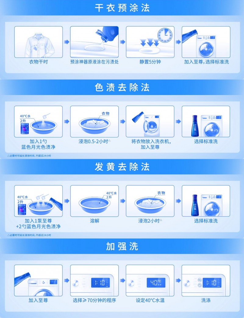 作为行业深耕多年的代表性企业,蓝月亮始终以技术创新驱动产品升级,推动洗护方式从“洁净”走向“科学”。2025年,蓝月亮结合至尊洗衣精华、预涂神器与蓝色月光色渍净三大产品,推出“至尊洗衣三锦囊”洗护方法,系统总结三项科学实用的洗衣技巧:一是预涂法,油斑、衣领渍用预涂法静置5分钟再标准机洗;二是浸泡法,色渍发黄先浸泡 0.5-2 小时再标准机洗;三是时长法,根据衣物性质与换洗周期,调整清洗时间与水温。这三大洗护方法旨在通过产品与方法“双管齐下”,实现对污渍类型与洗衣模式的精细化应对,推动消费者从“会洗衣”迈向“懂洗衣”,以科学洗护理念引领高质量生活方式。