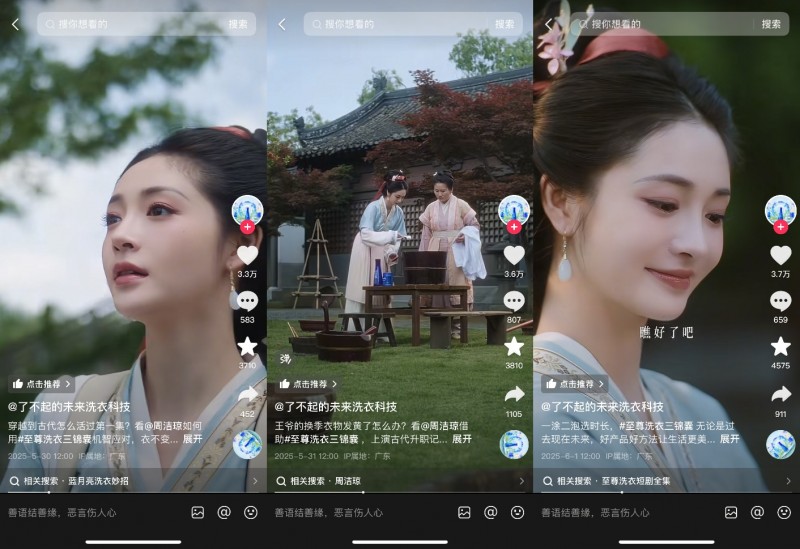 微短剧《穿越时空的洗衣锦囊》以宋朝为时代背景,讲述了蓝月亮研发人员穿越古代,用蓝月亮产品解决洗衣难题的故事。剧中,现代科技以“穿越金手指”的形式介入传统洗衣情境,通过轻喜剧叙事、趣味角色互动以及代入感强的生活场景,提升了观众对科学洗衣理念的认知度。多位用户自发晒出与角色共鸣的使用体验,进一步带动了对浓缩洗护知识的关注与讨论,实现了从观看到行动的深度转化。