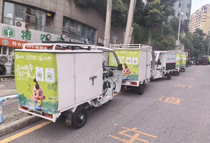 山城夏日,一辆辆张贴了巫山脆李主题车贴的顺丰配送车穿梭在街头巷尾,格外引人注目,“果霜白 巫峡绿”的清爽色调为这座城市增添一抹夏日的清凉,也成为了巫山脆李的“移动品牌长廊”。同时,重庆300余家驿加易社区门店、顺丰驿站和顺丰自营网点也穿上了“绿”装,众多顺丰“小哥”变身“推广大使”。