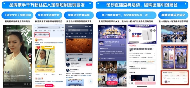 家居市场竞争激烈,既要打造优质内容强化品类心智,更要通过构建种收闭环来实现品牌价值的最大化。今年,宏宇陶瓷通过“生服ip 短剧 团购直播大场”的形式,实现了品效突围。具体而言,在线下,结合4月潭州陶瓷展,宏宇陶瓷发布新品,m并推出「理想星居馆」全域ip,做好内容储备;在线上,品牌携手千万粉丝达人,定制了创意短剧「“砖”业女总」的预告活动。陶瓷展期间,品牌定向邀约星图达人打卡扩散,同步开展直播盛典,以团购、达播承接流量,实现爆发,单日成交gmv过千万,跻入抖音团购直播留资榜top 1。