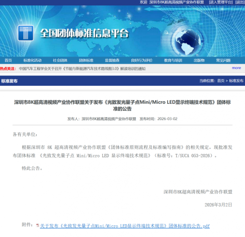 近日,由深圳市8k超高清视频产业协作联盟归口,利亚德、赛富乐斯、电子标准院等多家行业领军企业与科研机构共同制定的《光致发