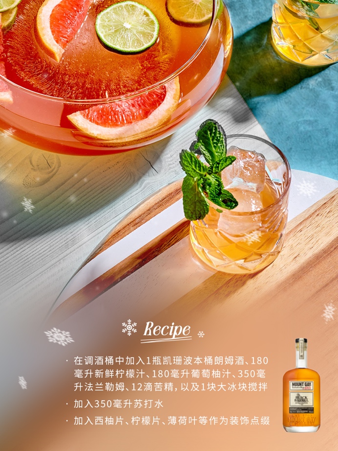 凯珊圣诞潘趣桶:在调酒桶中加入1瓶凯珊波本桶朗姆酒、6盎司新鲜柠檬汁、6盎司葡萄柚汁、12盎司法兰勒姆、12毫升苦艾酒,加入冰块搅拌,加入350毫升苏打水,可加入西柚片、柠檬片、薄荷叶等作为装饰