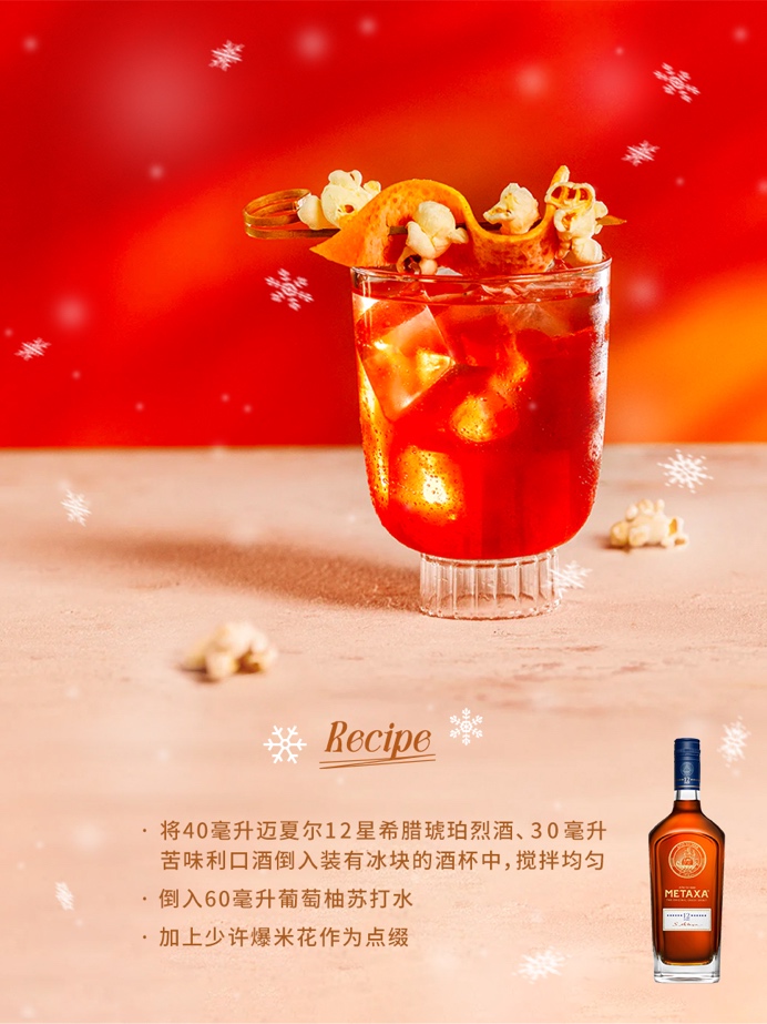 将40毫升迈夏尔12星希腊琥珀烈酒烈酒、30毫升苦味利口酒倒入装有冰块的酒杯中,搅拌均匀,倒入60毫升葡萄柚苏打水,加上少许爆米花作为点缀。