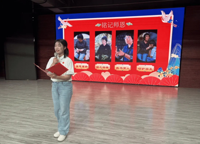 比赛尾声,由19名选手共同呈现的集体朗诵节目《师恩如光,照亮人生》将现场推向高潮。他们慷慨激昂、精神饱满地朗诵,倾诉着对老师的感恩之情、赞美之意,情到深处时更是令全场观众哽咽动容。