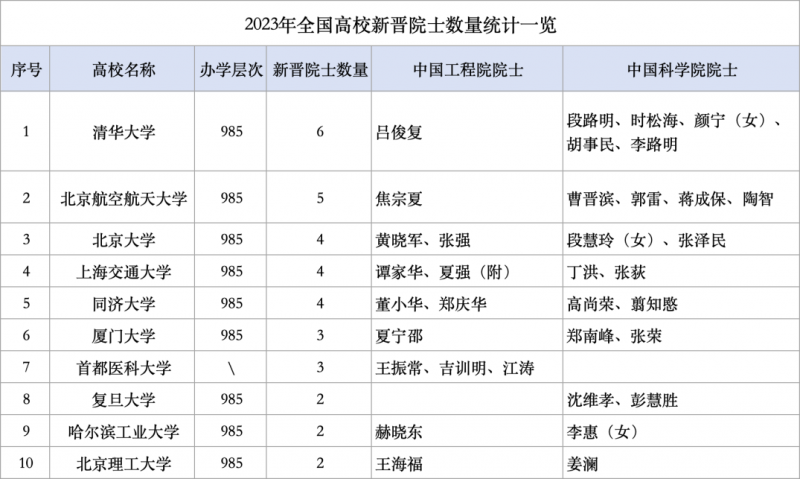 在2023年成功增选的133名院士中,其中共有85名来自全国50所高校(具体统计情况见下表)——其中,清华大学以6位新晋院士,名列全国高校第1名。