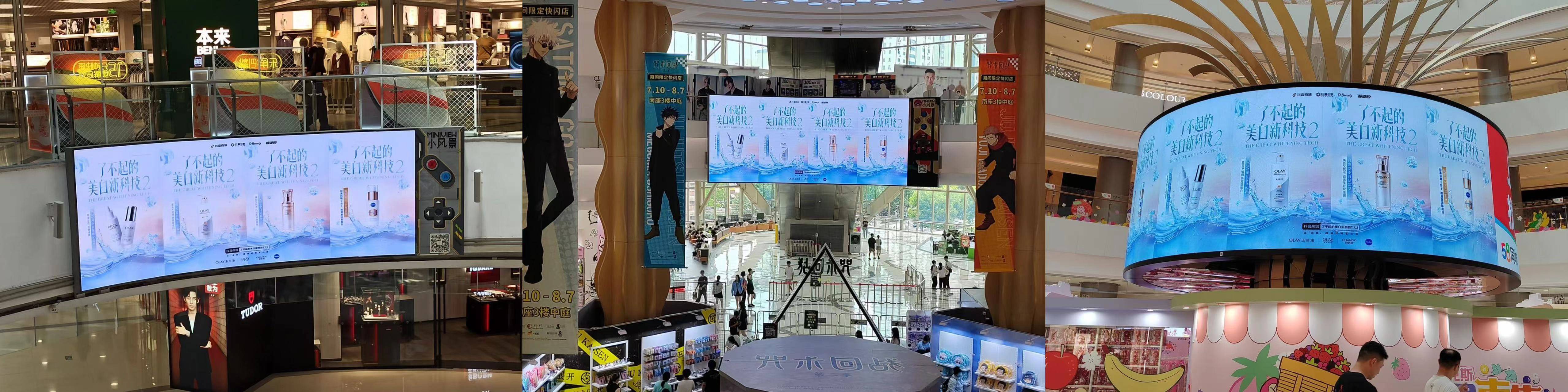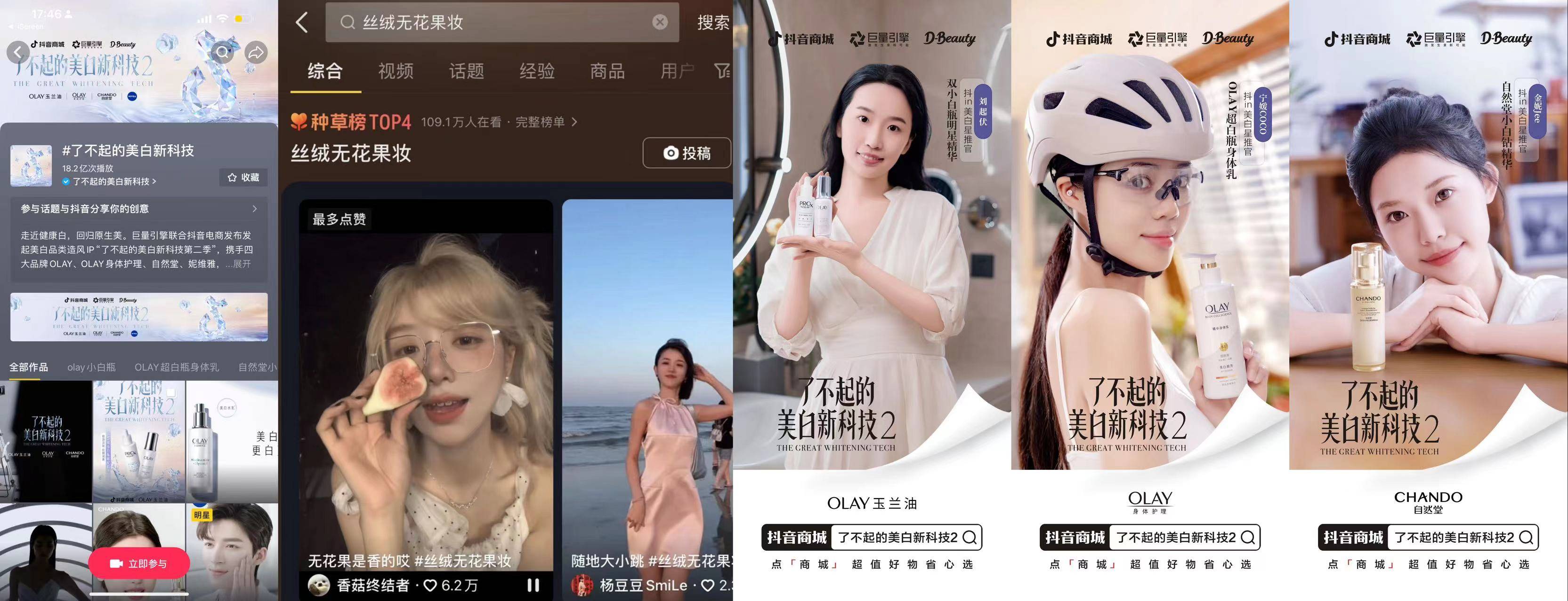 与此同时,olay、olay身体护理、自然堂、妮维雅四大品牌主题海报,也出现在抖音开屏等黄金位置,突出各大品牌王牌产品淡斑、美白、抗老、抑黑等「新科技」带来的「健康白」新改变。配合线上活动,7月17日至22日,广州、上海两大城市黄金商圈大屏也对主题海报进行强势曝光,打造出线下触达、线上搜索与购买的消费链路。