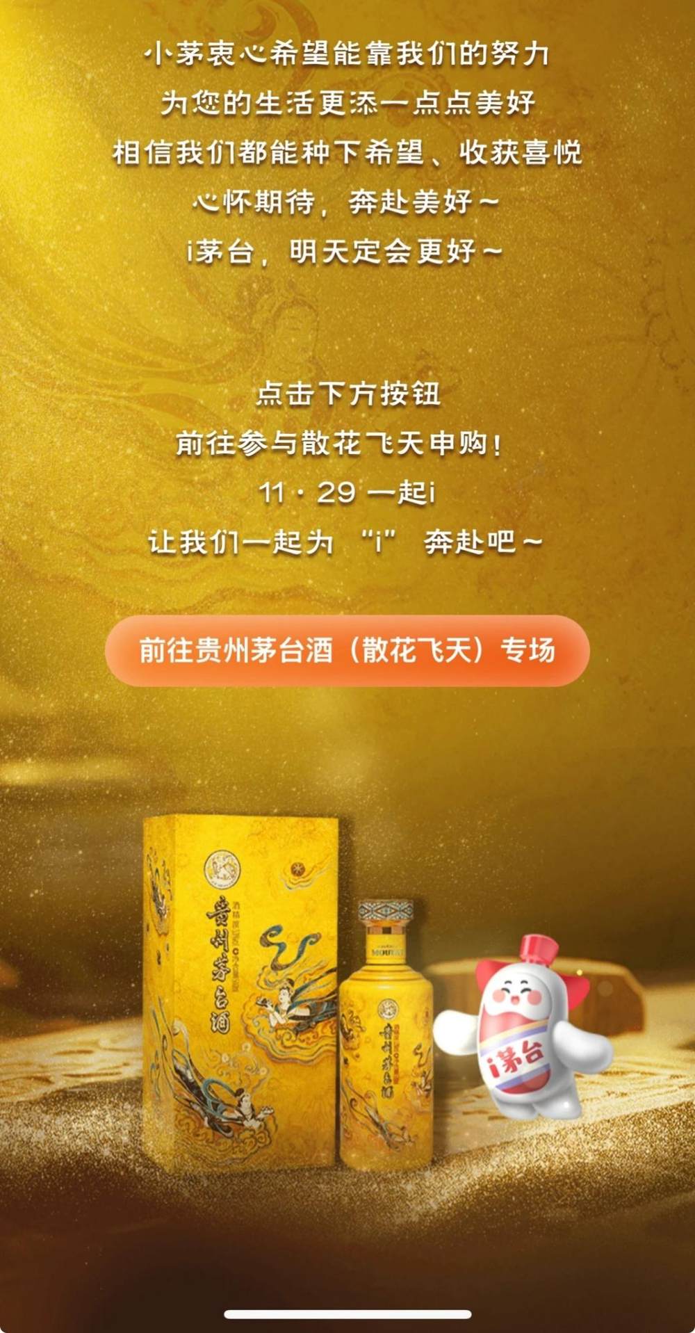 延续前两届感恩回馈的情感基调,今年“11·29”年度品牌活动“i”意明显更浓。首先是参与条件更加便捷。据了解,在“i有期待 奔赴美好”板块,消费者只需于11月29日9:00-12月1日18:00之间浏览完成活动页面,即可点击报名参与申购;而申购对象,则是茅台重磅推出的第一款飞天文化系列酒“散花飞天”。