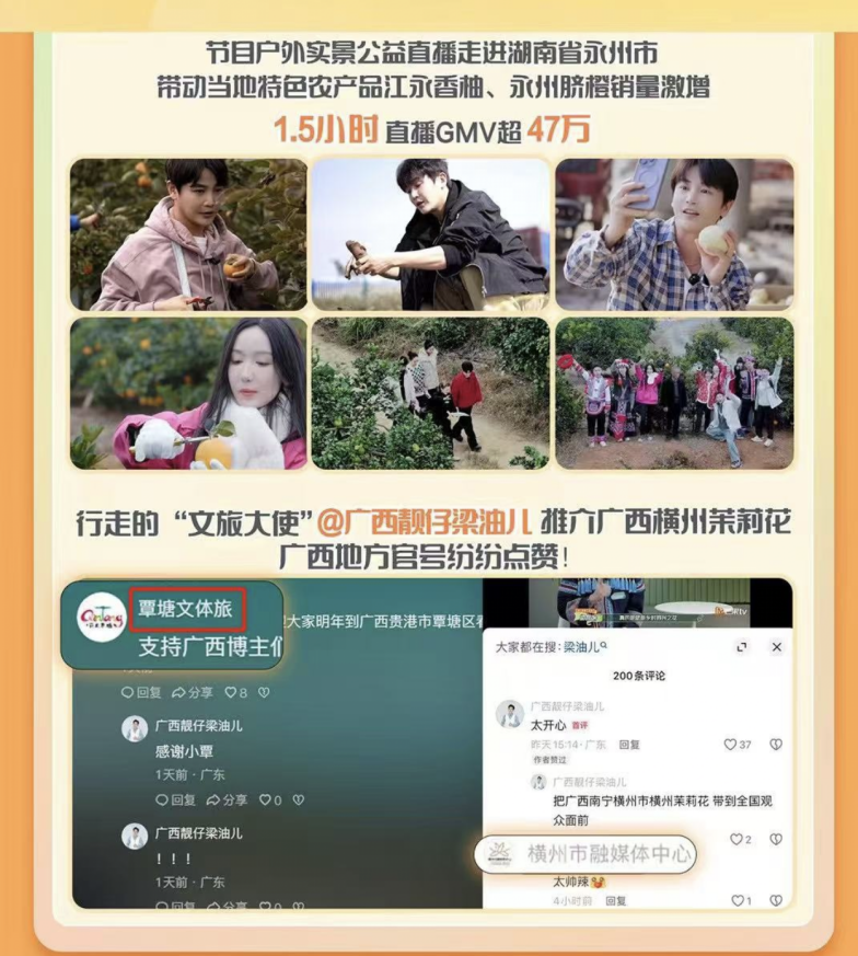 除此之外,《超级推荐官》还联动了文旅和50 国货企业,共同守护国货之光。通过推荐官与流量明星的户外实景公益直播,节目成功带动了湖南省永州市的特产销售,1.5小时内直播gmv超过47万,展现了综艺营销的强大力量,同时助力了乡村振兴和国货产品的热产热销。节目嘉宾梁油儿还通过《超级推荐官》成功安利广西横州茉莉花,获得了广西各大地方官号点赞支持,也赢得了广大网友的好感,助力广西茉莉花走向全国。