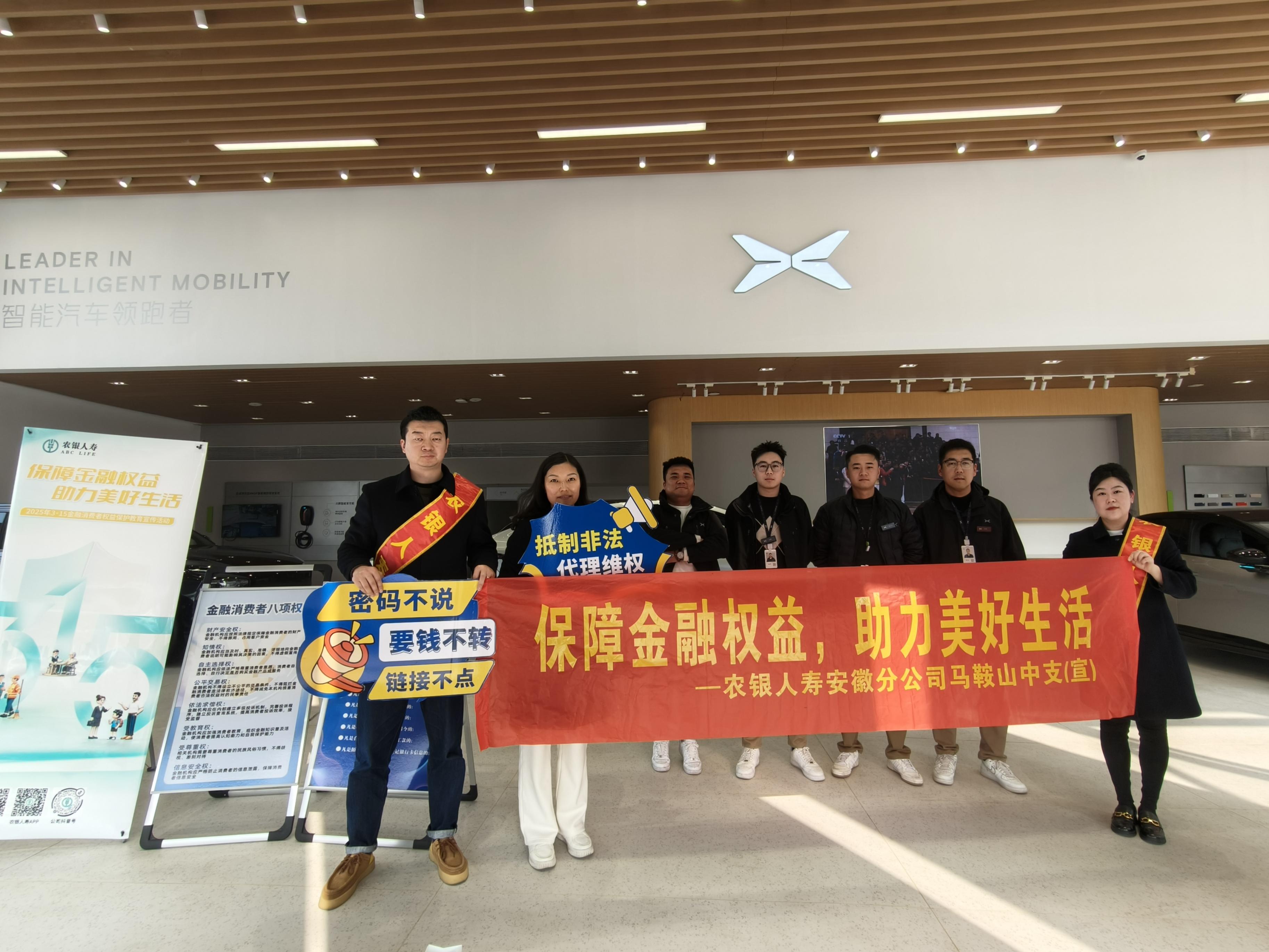 3月10日下午,农银人寿马鞍山中心支公司前往马鞍山湖西南路小鹏汽车销售服务中心开展以“保障金融权益 助力美好生活”为主题的金融宣传活动,旨在提升社会公众的金融素养,增强风险防范意识,切实维护金融消费者的合法权益。