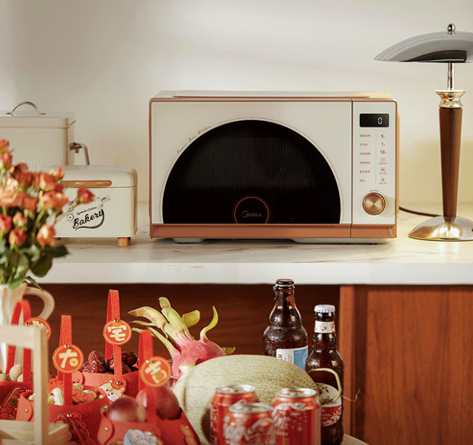 另外,为了给消费者提供更贴心的烹饪体验,美的微波炉凭借创新的设计重塑了家庭厨房的烹饪环境。黑胶美学设计与复古氛围的相得益彰,面板的倾角设计优化了使用视角,让用户在站立操作时无需弯腰,轻松掌控每一步的烹饪过程。与此同时,隐藏式下拉手的设计既保证了操作简便,又彰显了简约大气的视觉效果,符合现代家庭对功能性和美学的双重追求。而砂金色拉丝旋钮的加入,更是让整体设计质感提升到一个新的高度,使其能够与厨房环境完美融合,提升整个居家空间的档次。