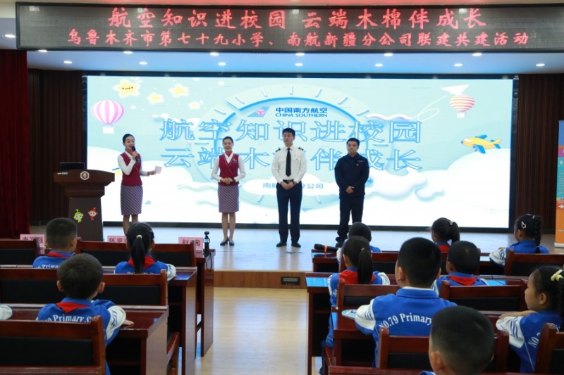 心至苍穹外,目尽星河远。为普及航空知识,践行“亲和精细”服务品牌,激发广大青少年对于航空事业的兴趣和热爱,5月27日南航新疆分公司走进乌鲁木齐市第七十九小学,开展“航空知识进校园,云端木棉伴成长”联建、共建主题党日暨主题团日活动。