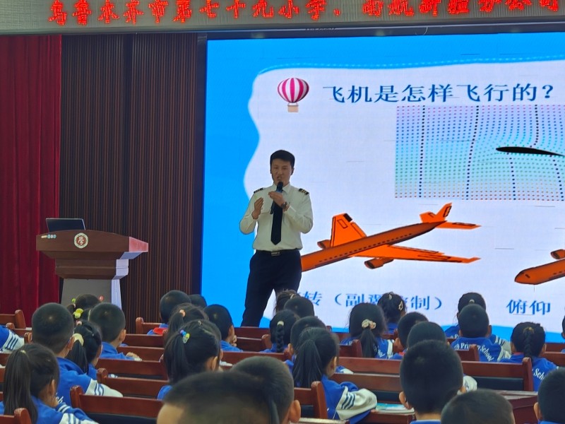 “飞机是如何产生的?”“飞机是怎样飞行的?”“飞行员是如何工作的?”南航新疆分公司飞行部飞行员李军强通过问题引入航空知识,以生动的表达,向300余名同学详细介绍了飞机的发展历史,飞行原理及飞行员的日常工作,以飞机的安全运行为轴心,带动学生们构建对于蓝天的向往,以兴趣领航,播蓝天愿望。