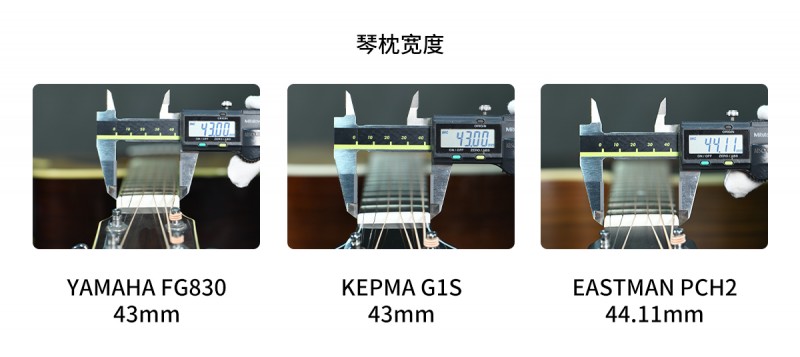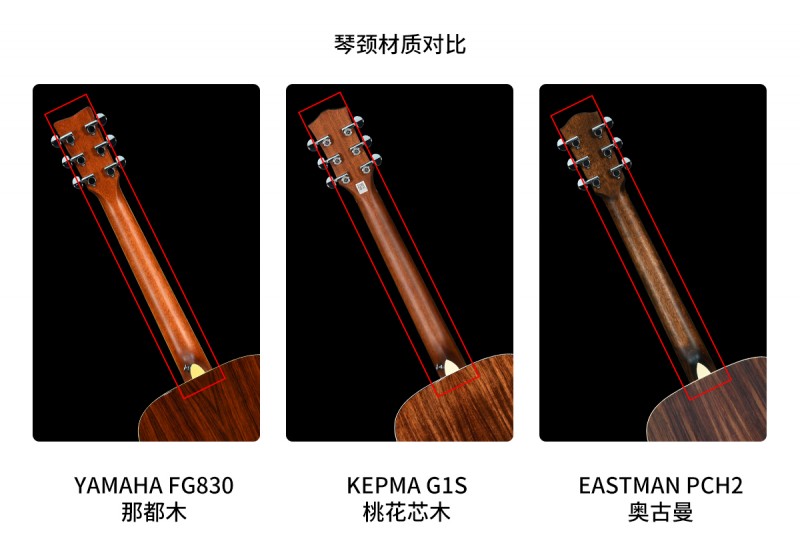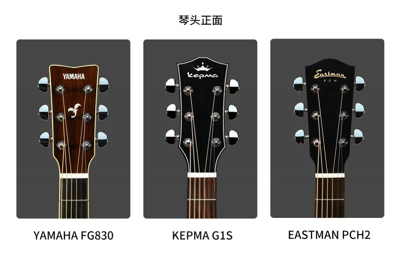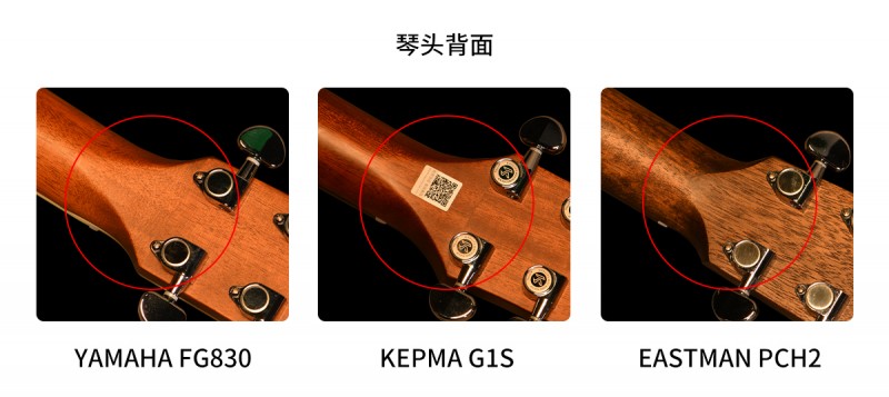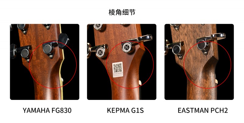 三家在琴头各处细节的控制上,主要体现为cnc数控生产和手工打磨的差别。①yamaha fg830和eastman pch2均为人工打磨,导致部分产品会出现左右不对称、棱角缺失、线条变形等问题;