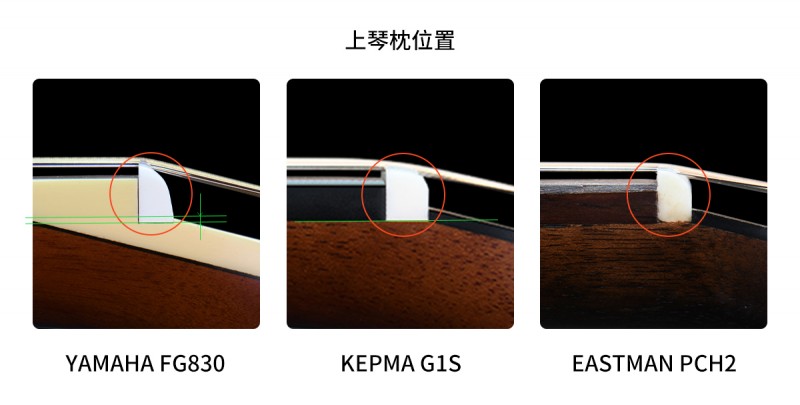 在上图中可以看出,eastman pch2和卡普马在琴枕安装工艺上相似,但在细节处理上,存在漏胶、毛边的情况,相比之下卡普马更胜一筹,而yamaha fg830的弦枕则完全不在指板与琴柄相交的延长线上,且粘合处留缝较宽。