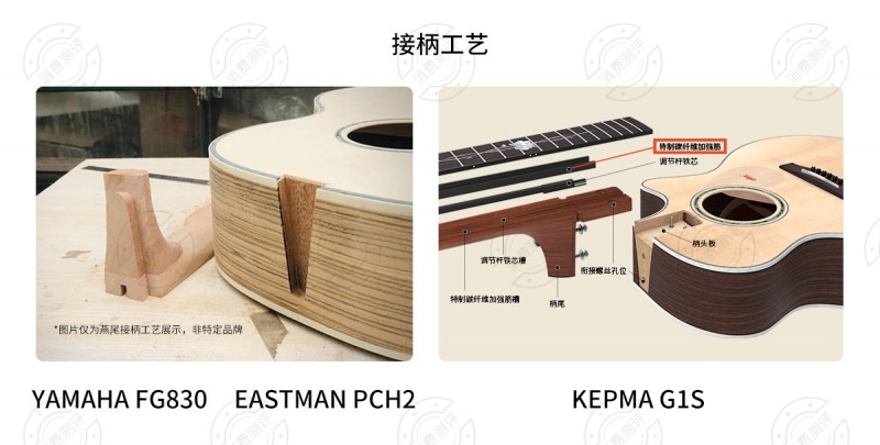 接柄工艺通常有两种,一种是在中低端吉他应用较多的燕尾式接柄,另一种是多用于高端吉他的分离式接柄,二者在工艺和成本上差异巨大。