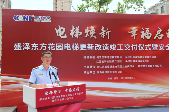 吴江区市场监督管理局杨定登科长,代表吴江区市场监管局向项目顺利交付表示热烈祝贺。确保电梯安全性,始终是工作首位。通过严格把关、精心组织、科学施工,我们成功完成此次29台老旧电梯焕新升级。新电梯在安全性、舒适性、节能性等方面都有了显著提升。同时,后续的维保服务、文明乘梯同样重要,让我们携手并进,共同为人民群众创造更加安全、舒适、便捷的生活环境。