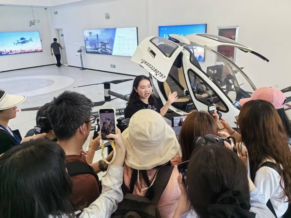 图为在合肥骆岗空中交通运营中心,工作人员介绍eh216-s飞行器的特点。