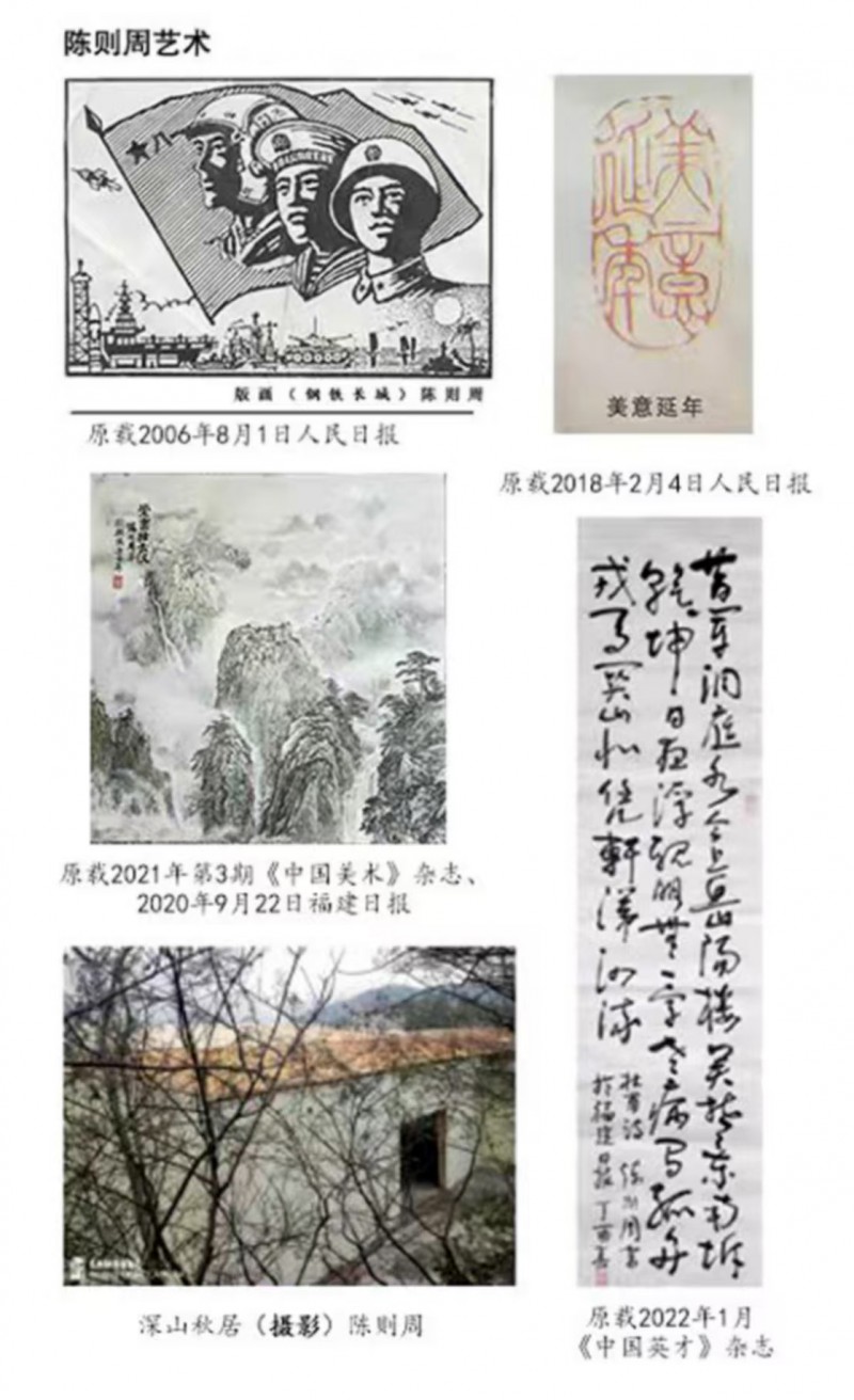博学多才陈则周名列巜世界名人录》《世界国宝级艺术名师收藏大典》等。荣获文学界最高奖鲁迅文学奖、散文作为福建省中考语文试题、两篇论文成中国人民大学教材。作为著名书画大师其书画悬挂人民大会堂,被中国国家博物馆等收藏,制作邮票入碑林。数十位党和国家领导观看他书画、篆刻、演唱并合影。这位书画大师也是国家一级美求师、高级工艺美术师。近年其国画、书法多次在国内外拍卖出较高价。数十年人民日报8次报道其业绩,并刊登其书画七八十幅,成为在人民日报发表书画数量最多者。此外他先后在人民日报、新华社、福建日报等刊登报告文学《八闽抗天曲》,及《激情西湖》《福州防空袭演习侧记》《美丽鼓岭》等报道,翔实生动记述当年跟随采写时任福建省长的习近平总书记主政福建期间的光辉业绩。这位著名音乐大师多次获央视、光影卫视、世界明星金奖,上过春晚。2024年央视等推出陈则周大型演唱会,2025年央视及光影视联办《陈则周杯歌手大奖赛,他为这捐资38万元。目前众多人在报名参赛。“勤为径,诚则周”,他诠释自己名字,寓意刻苦心诚才能成全其业并日臻全面!数十年来他以此格言不懈奋发,向世界传播中华优秀传统文化和新吋代文艺兴盛作出卓越成就和杰出贡献,为祖国争了光。他感恩党关怀感谢福建日报培养和社会各届支持。