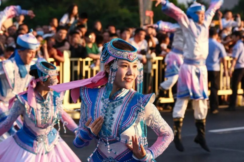 7月29日,在内蒙赤峰市,演员在花车巡游中表演民族舞蹈新华社记者 马金瑞 摄
