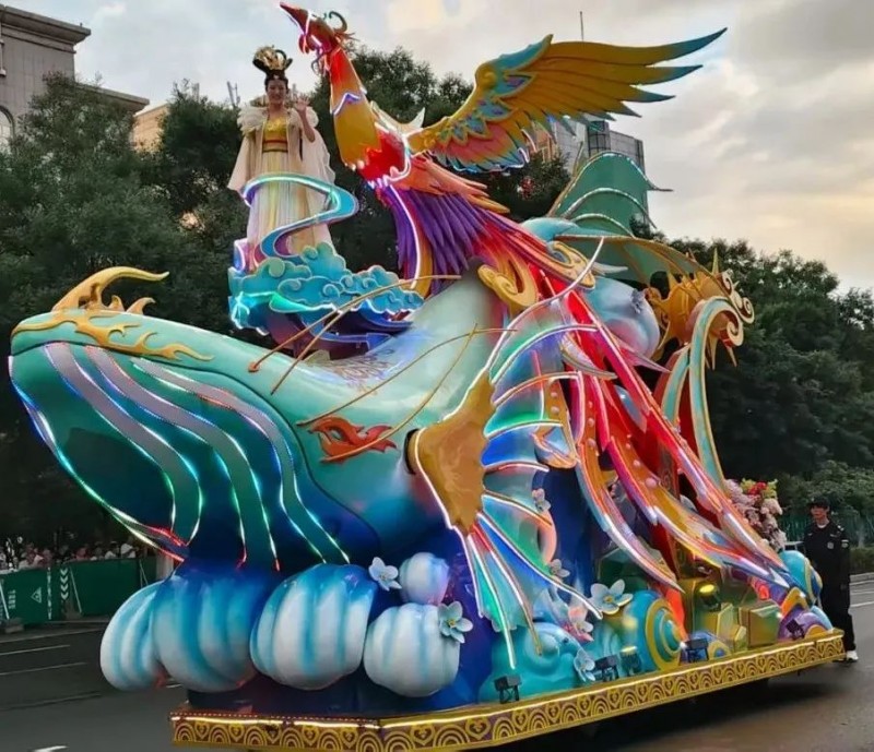 彩卵的弧度复刻了红山文化玉璧的曲线,云纹的流动暗合《山海经》中“凤凰翔于东,鲲鹏击于南”的宇宙观。当机械装置带动简狄的衣袖缓缓舒展,五色彩卵在灯光下依次亮起——赤象征火焰,黄代表土地,青呼应草木,白对应云朵,黑隐喻深渊,恰是华夏先民对“天地五行”的最初认知。而花车后半部分神兽凤凰展翅翱翔九天,整个花车高低错落生动形象,具有强烈的故事感,各个形象造型对比强烈增加整个花车的视觉冲击。展示出花车不止是“展示神话”,更是让神话“活”在当下。
