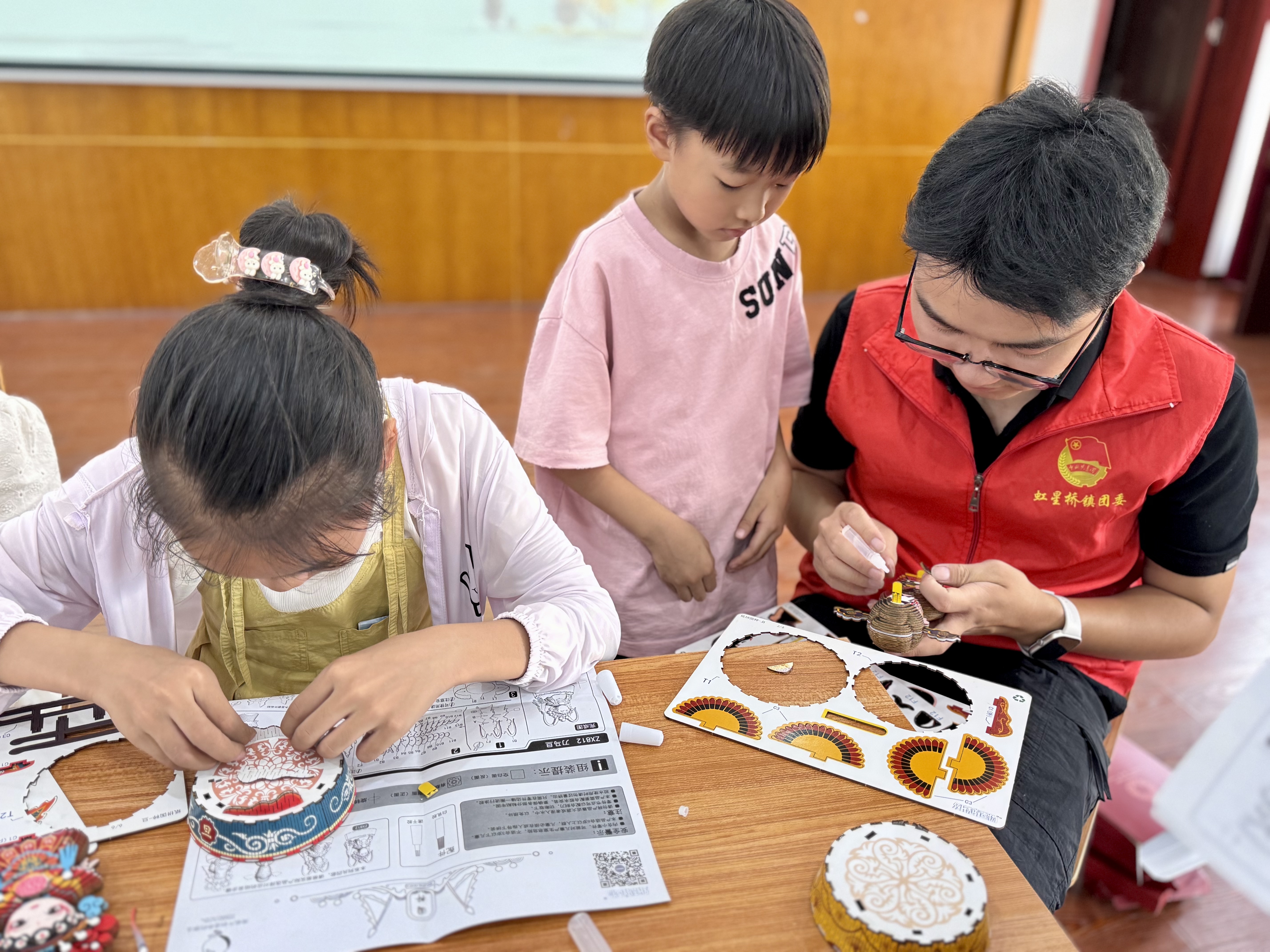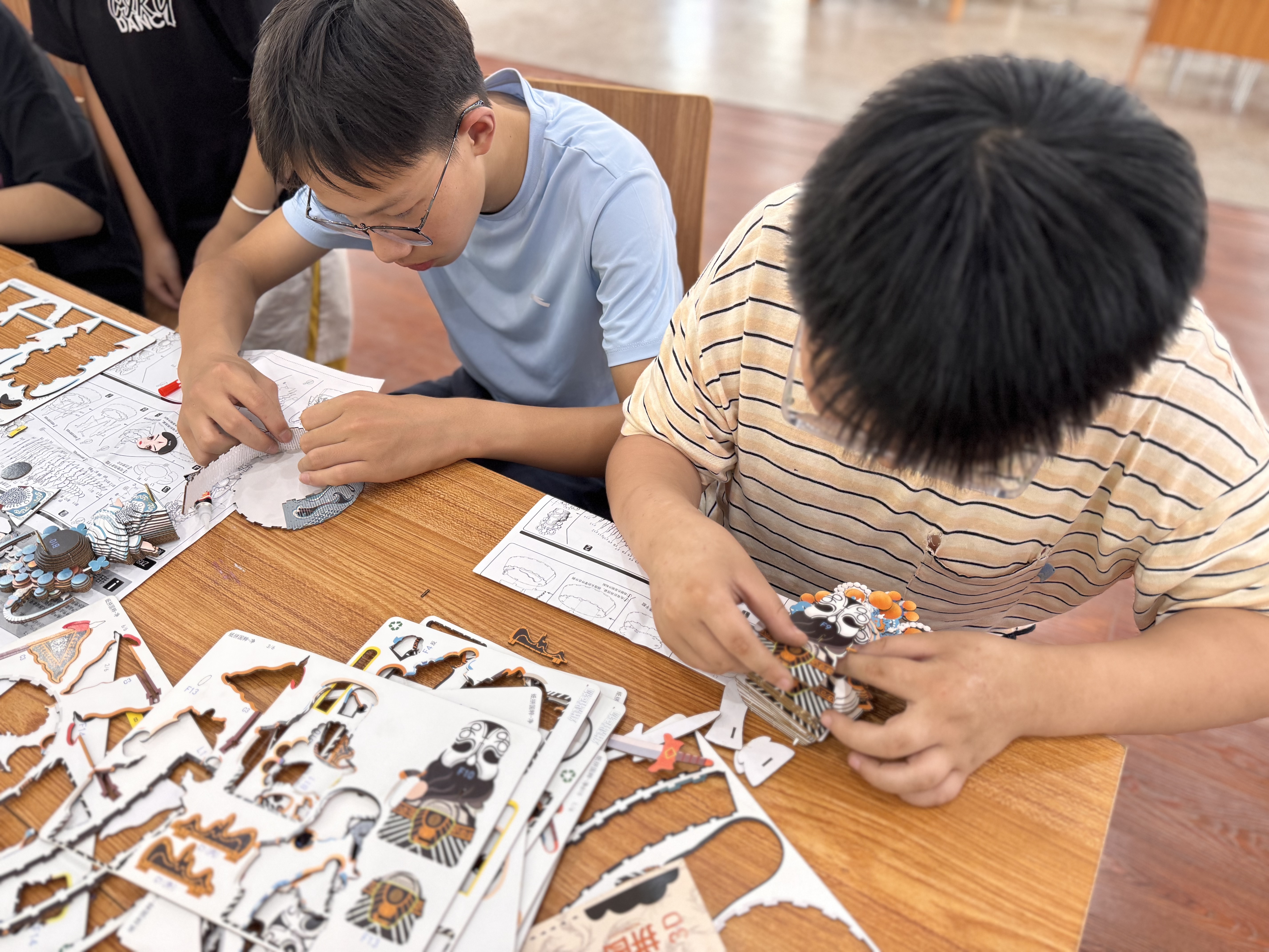 制作环节中,孩子们充分发挥创造力,专注制作属于自己的戏曲角色拼图。他们围绕人物的服饰、妆容和头饰精心拼装,过程中还不时互相协作、交流想法。经过将近一个小时的努力,一张张彩色纸片在他们灵巧的手中逐渐蜕变,变成了一个个栩栩如生的戏剧人物。每一个拼图都凝聚着孩子们的心血与创意,大家兴奋地相互展示自己的成果,现场气氛十分热烈。