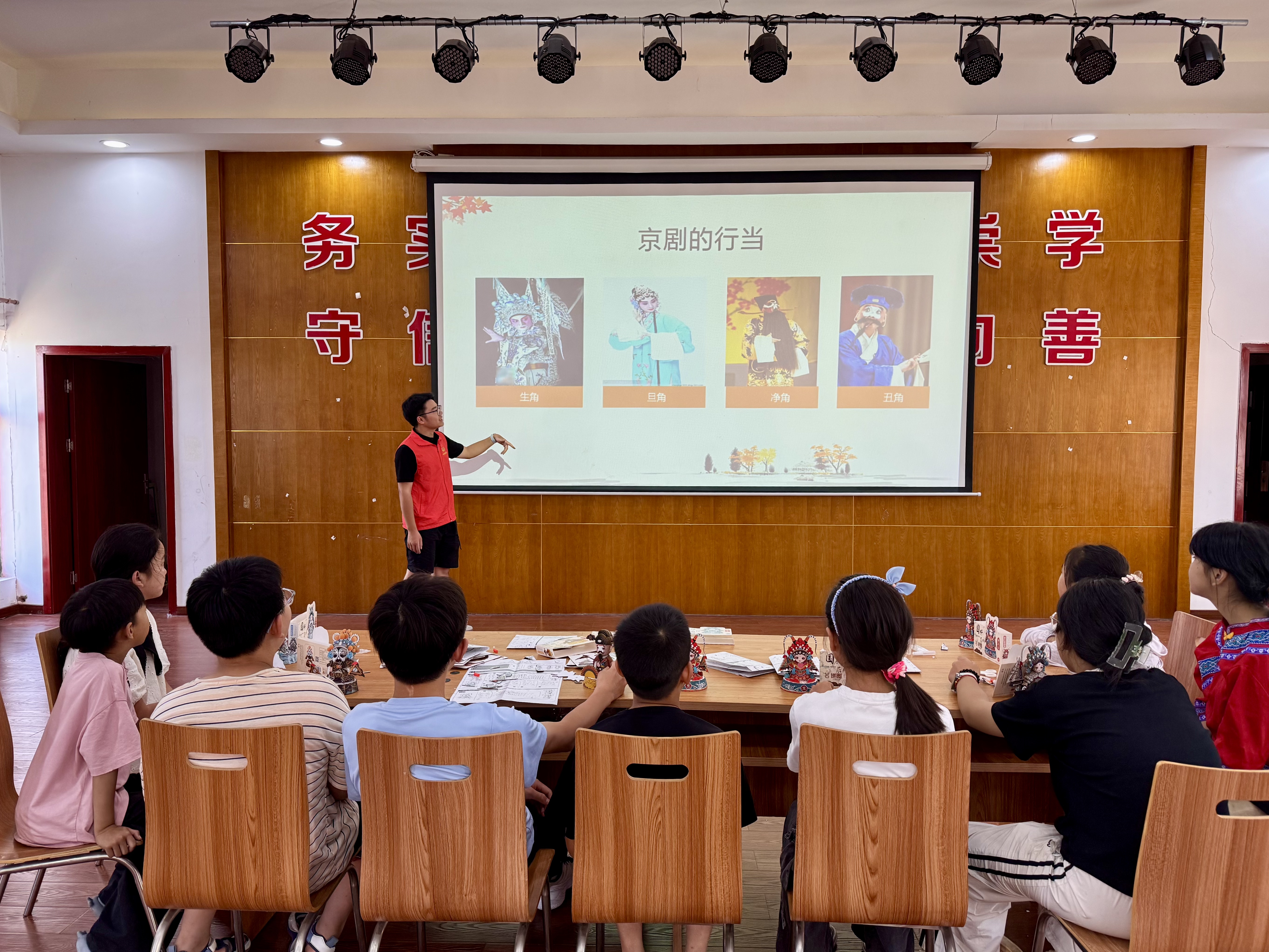 活动伊始,青年志愿者向孩子们介绍了京剧的相关知识,细致讲解生、旦、净、丑等京剧角色的历史渊源与鲜明特点。英俊潇洒的小生、端庄秀丽的青衣、威猛霸气的花脸、风趣诙谐的文丑,一个个鲜活的形象让孩子们对每个行当的人物造型有了立体且直观的认知。