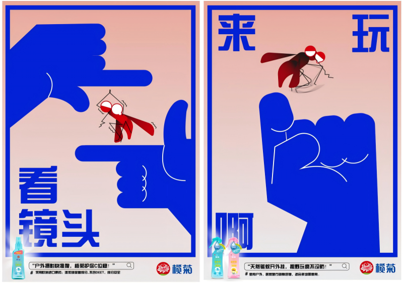 作品《榄菊驱蚊液系列广告海报》以 “安全、随身、多场景” 为产品锚点,通过极简扁平风与高饱和颜色反差的调性,传递“免受蚊虫烦扰”的实用价值和“陪伴青春、助力自由”的情感价值,同时利用线上渠道尤其是电商和直播平台,结合幽默化文案与符号化视觉设计,强化与年轻人的互动和共情,致力于从 “国民经典品牌” 转变为 “年轻人的青春队友”。
