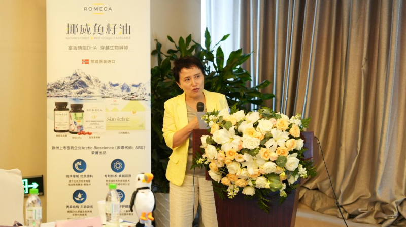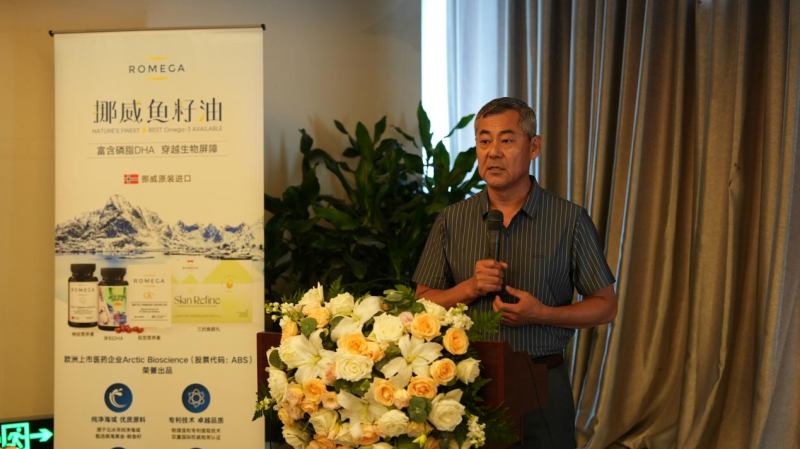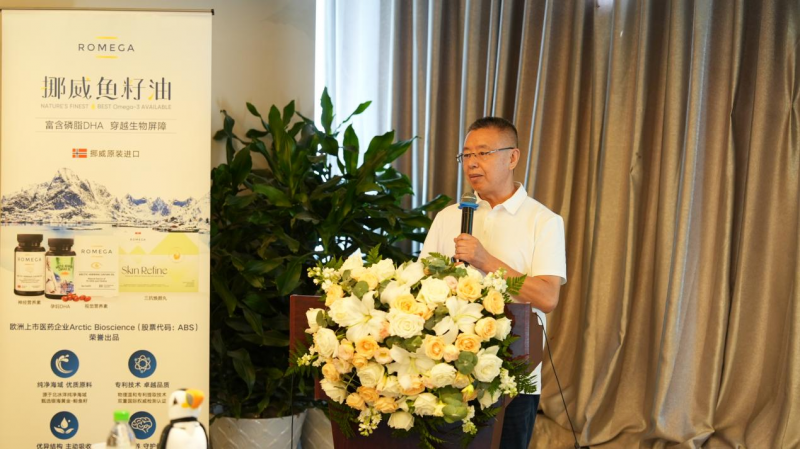 在学术交流环节,romega 中国总经理慈宏亮博士率先发表题为《romega 挪威鱼籽油及其在银屑病的应用》的报告。他首先明确 romega “炎症自然消退领域开创者” 的定位,强调企业发展深度契合中挪 “蓝色经济” 宏观战略,依托专有技术开发独特海洋生物活性物质。