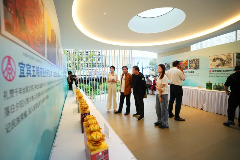 书画是凝固的诗行,酒是流动的画卷。书画与酒一直以来都是中国文人情思中最为贴近的两脉。在雅集序幕的创作笔会环节,万茗堂精心打造的文化展示区成为现场焦点。这里陈列的《五粮液股份春夏秋冬月光曲酒》《五粮液股份春夏秋冬盛世纪念酒(花下醉)》《五粮液股份五粮文创丝路瓷韵纪念酒》《五粮液股份五粮文创盛世和美纪念酒》等多款文化创意酒品,以其独特的设计理念和深厚的文化底蕴,吸引了众多艺术名家的驻足欣赏。