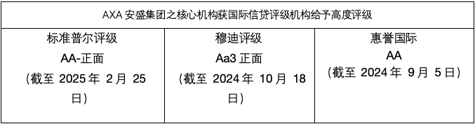 - 荣获专业保险评分机构10life根据分红表现及经验因素授予「稳定分红实现率公司2025」评级14,反映axa安盛在分红管理方面的持续经验与稳健表现。