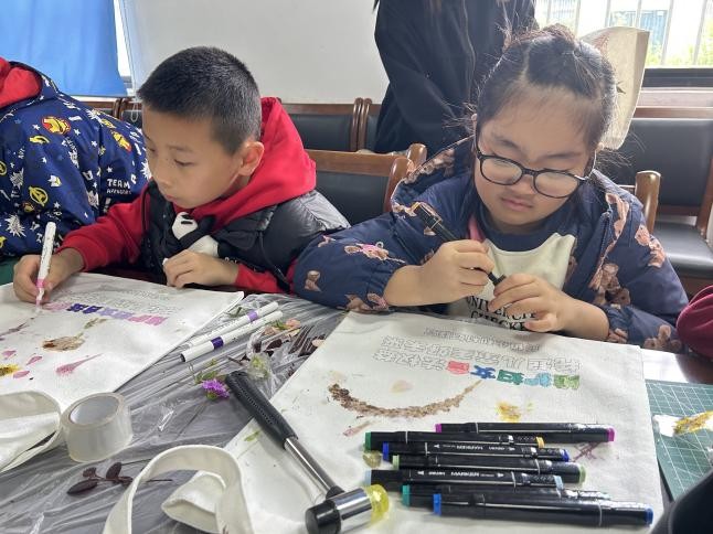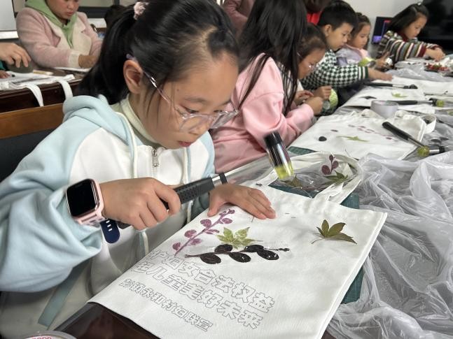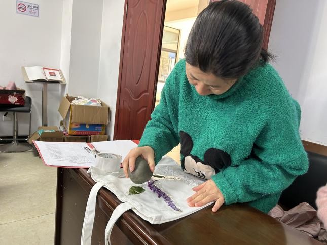活动在“植物拓印工坊”中拉开序幕。在社工和志愿者的指导下,大家精心挑选叶片与花瓣,巧妙布局在印有“维护妇女合法权益 托起儿童美好未来”标语的帆布袋上。随着小锤富有节奏的敲击,植物的天然色素与形态被拓印在帆布上,形成独一无二的艺术品。这不仅是一场创意手作体验,更是一次潜移默化的维权关爱教育。一位参与活动的母亲表示:“这个袋子既美观又有意义,每次使用都会提醒我,要把权利和爱放在心上。”