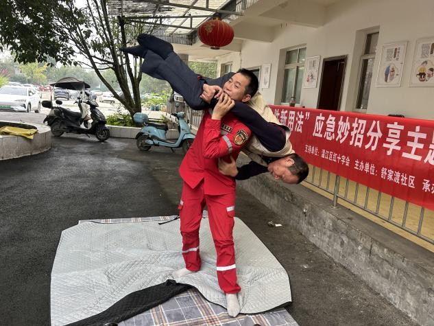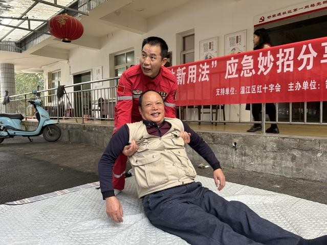在如何安全转移伤员的环节,左老师展示了如何利用一张床单和几根木棍,快速制作成一架牢固的简易担架。老人们亲手参与折叠、穿杆、固定的全过程,惊叹于日常用品在危机中竟能发挥如此关键的作用。此举不仅解决了在专业救援设备抵达前的移动难题,更极大地提升了老人们在意外现场的自救互救信心。