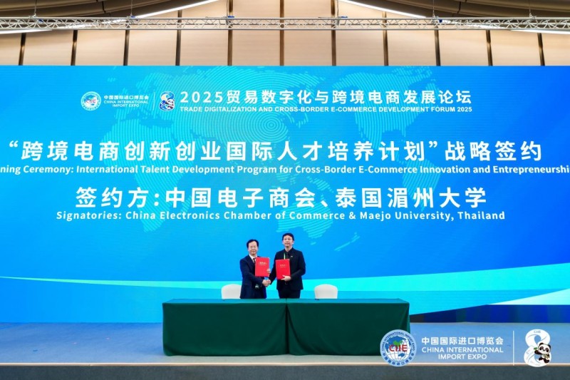 中国电子商会副会长兼秘书长彭李辉与泰国湄洲大学副校长柴约特·苏姆里萨坤签署“跨境电商创新创业国际人才培养计划”。多方紧密合作,展现双方在数字贸易领域的务实合作新格局。