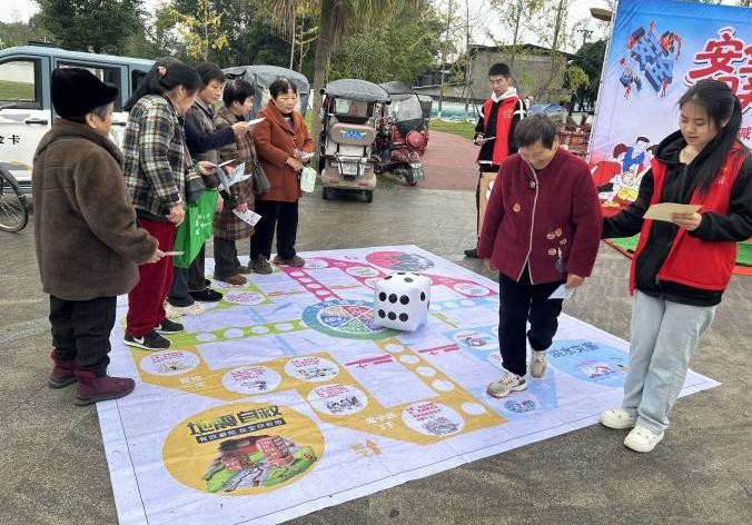 巨大的飞行棋棋盘铺展在地面上,棋盘格内设置了各类防灾减灾问题与情景模拟。居民通过投掷骰子前进,每至一格都需回答相应的安全知识问题,如“地震来时如何躲避?”、“厨房油锅起火怎么办?”,在一步步走向终点的过程中,居民进一步巩固了日常防灾要点。