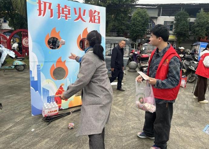 “瞄准,投掷!”在“消灭火种”游戏区,居民们化身为“消防员”,将沙包精准地投向代表火种的kt板。游戏要求参与者在规定时间内投中5个“火种”即可获得通关贴纸。这不仅富有趣味性,更锻炼了大家在火灾初期的快速反应和心理素质。