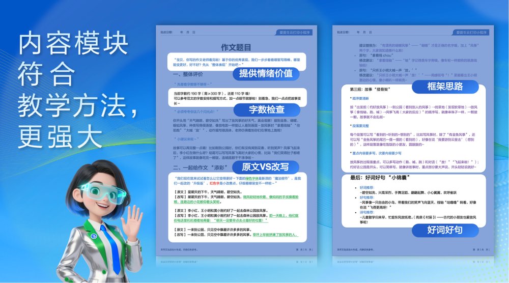 事实证明,这一构想可以实现:用爱普生ai打印机就可以了。家长通过“爱普生云打印”小程序上的“ai学习助手”功能,点击“作文批改”按钮,上传作文照片,选择对应的年级,仅用一分钟即可一键生成并打印出批改结果,包括错字识别、清晰的语病标注,对比错误语句与修正版本,更有兼具语文老师专业度与人文温度的作文点评,以激励与启发式的批改,为孩子开启一扇爱上写作的大门。