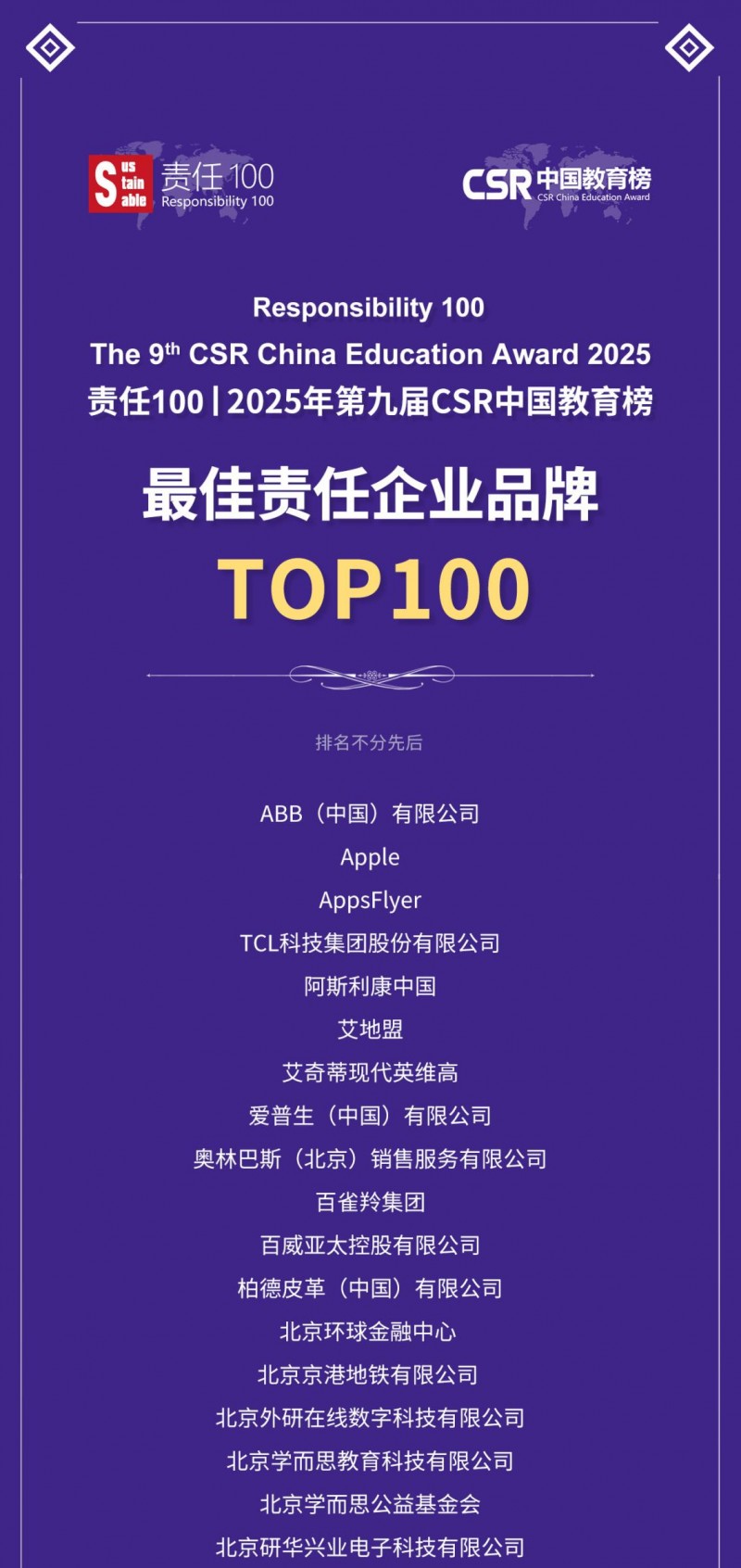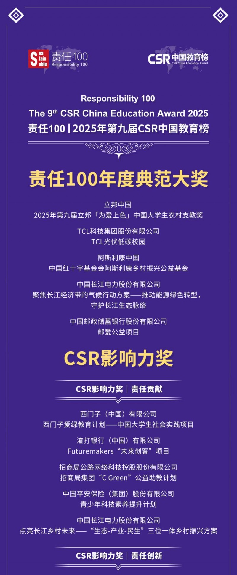 2025年11月26日,“责任100|2025年第九届csr中国教育榜”奖项正式发布。共有124家企业入围“最佳责任企业品牌”,超过100家全国媒体、地方媒体和专业媒体共同发布。本届教育榜共有272家国内外领先企业参与申报,经严格评审,124家企业的142个优秀项目脱颖而出。