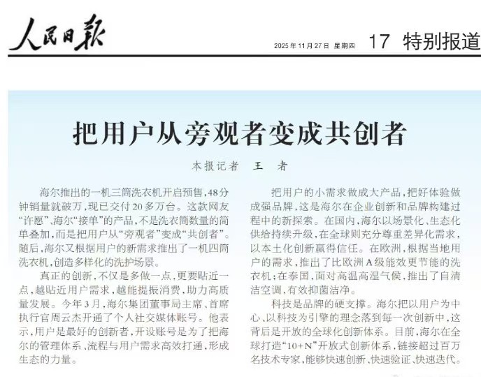 《人民日报》17版则聚焦一台洗衣机背后的创新故事。海尔三筒洗衣机预售48分钟销量破万、交付超20万台的成绩,源于一场“用户许愿、企业接单”的共创实践。今年3月,海尔集团董事局主席、首席执行官周云杰开通了个人社交媒体账号,直接倾听用户声音,推动管理流程与用户需求高效对接。依托“10 n”开放式创新体系,海尔跟用户共创出能分区洗护的三筒洗衣机,随后又迭代出“懒人洗家族”以及一机四筒洗衣机,满足多样化的洗护需求。