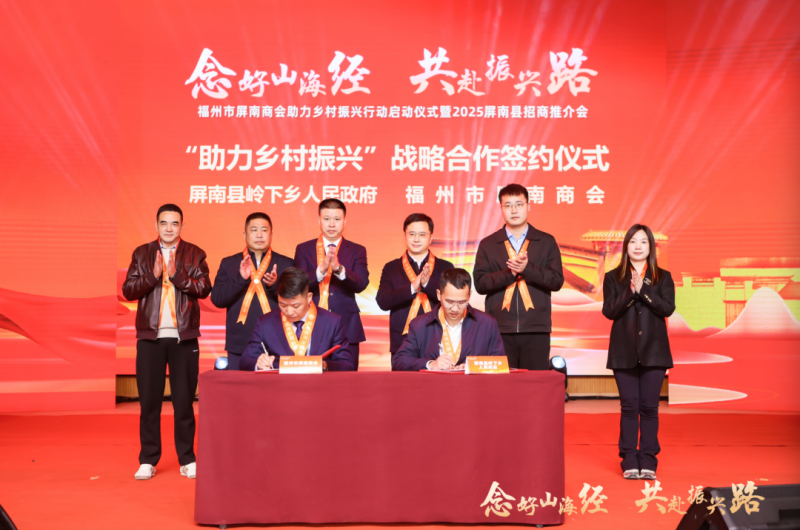 在屏南县委书记周春海、屏南县人民政府副县长何雷鸣、岭下乡党委书记张新建、福州市屏南商会商会会长黄造传、监事长江仕清、党支部书记施佳丽的见证下,福州市屏南商会执行会长陆万福与屏南县岭下政府乡长杨书勤签定了“助力乡村振兴‘战略合作签约’”,双方达成了一期实施项目合作,共4项:1、投资谢坑村农旅康养项目800万,2、投资岭下乡高山蔬菜净菜分拣项目500万,3、梨洋村樱花茶园项目500万,4、岭下乡奖教助学基金20万。