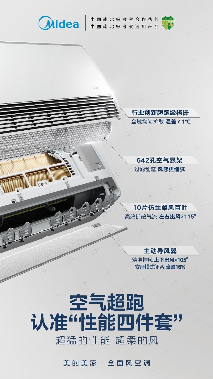 美的全面风空调以行业创新的“风结构”技术为核心,勇闯传统空调风感体验的“无人区”——不仅打破行业对“风”的单一功能认知,更精准破解了用户“既要冷暖快,又要吹得柔”的矛盾需求,以“空气超跑”为灵感,创新空调出风形态,用“快、准、强、爽”的极致体验,重新定义黄金风感标准,实现从“控温”到“控风”的本质升级,树立家用空调舒适新标杆。