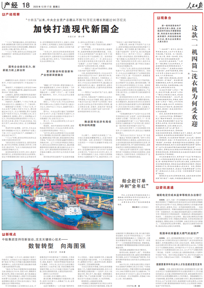 新闻行业垂直网站12月17日,《人民日报》第18版“观象台”栏目聚焦海尔“一机四筒”洗衣机走红背后的深层逻辑,高度点赞了其以管理创新赋能产品突破的高质量实践,引发广泛关注。