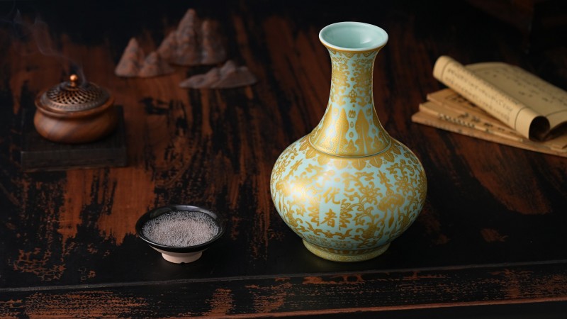 瓶型设计忠实复刻了原物“肚圆颈长”的经典造型——圆润饱满的瓶腹,象征着海纳百川的胸襟与容事气度;修长优雅的瓶颈,则透露出谦和尊贵的君子之风,这不仅是器型的复刻,更是东方处世哲学的视觉表达。瓶身釉色,是历经600多个日夜潜心研制、1300℃高温淬炼而成的“冬青釉”。其色青中闪绿,莹润如玉,呈现出春日青芽覆晨霜般的朦胧质感,清雅而不失生机,恰如君子之交,淡泊而长久。冬青之色,自古寓意基业长青、生命永驻,是对事业与生活最美好的祝愿。最为精妙的,是瓶身之上以纯手工描金技艺勾勒的缠枝莲纹与绽放牡丹。金线流转,勾勒出缠枝莲纹绵延不断,寓意富贵连绵、生意生生不息;牡丹雍容绽放,象征花开富贵、事业鼎盛;其间点缀的莲花,则暗喻清雅高洁的格局与品性。整体纹饰金碧辉煌却毫不张扬,在冬青釉底的衬托下,尽显皇家高雅与内敛的奢华。