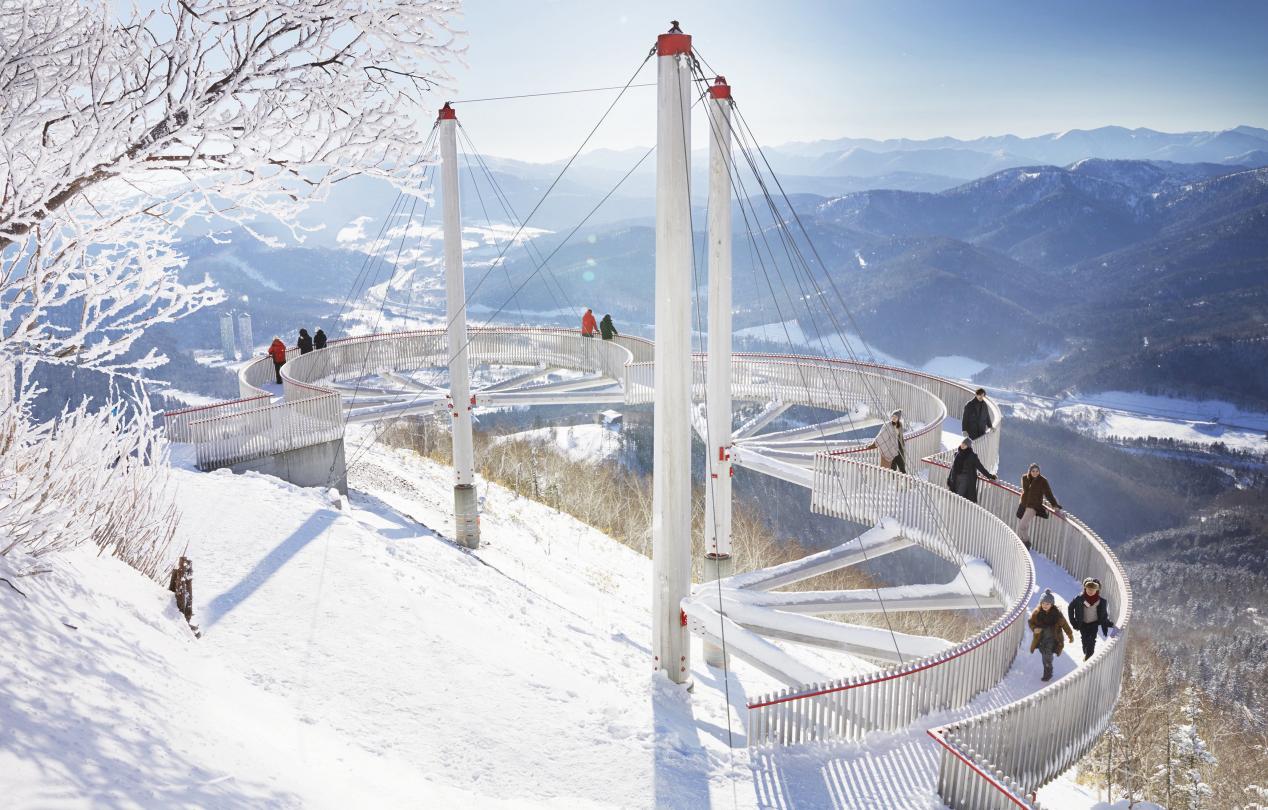 雾冰平台内分布着多处以云朵为灵感打造的独特观景点,如cloud walk和cloud bar,呈现出与夏季云海平台所截然不同的景观,可从多个角度欣赏壮丽雪景。