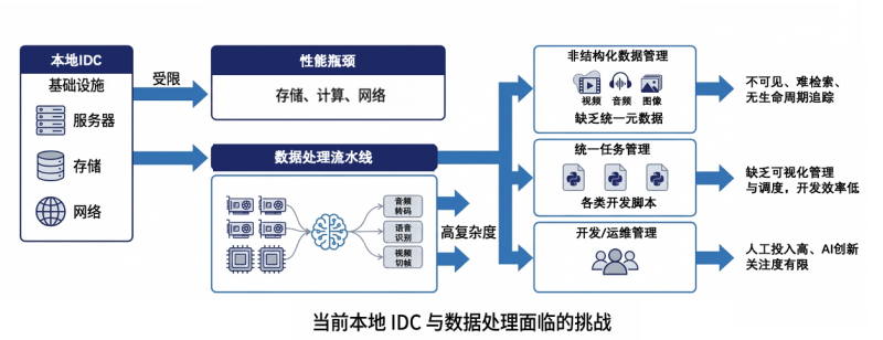 随着模思业务规模的扩大和模型训练对数据量、处理时效性的要求提升,原有idc基础设施在计算弹性、存储容量、i/o性能、网络带宽等方面已无法满足高并发、大规模音视频等多模态数据的处理需求。