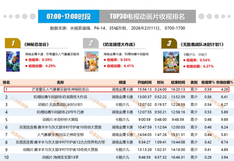 《神秘恐龙谷》自2月9日上线金鹰卡通卫视全国首播以来,迅速收获观众们的喜爱,登上白天时段收视率榜首。