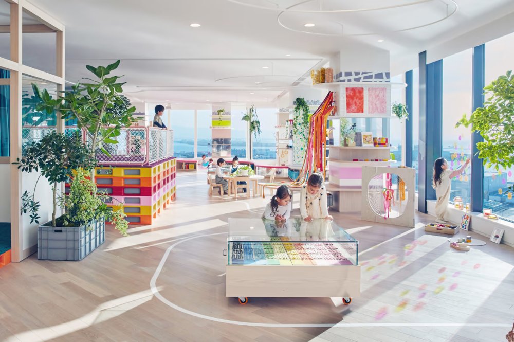 酒店顶层的28楼,是孩子们专用的atelier工作室。色彩与绘画、黏土与沙子、光影空间、材料工艺品等区域一应俱全,孩子们可以随着好奇心,用自己的方式尽情探索。还有「atelierista」专业人员从旁协助,引导发掘更多乐趣,让好奇心成为学习的动力。