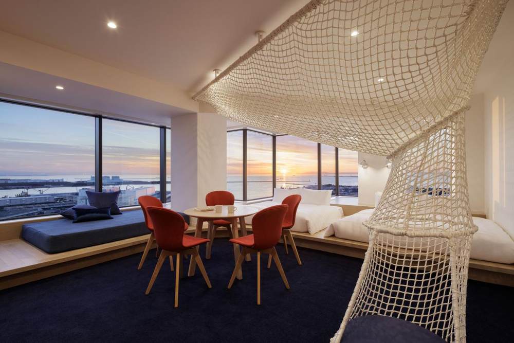 在「atelier room」主题客房中,孩子们可以使用彩色铅笔在墙壁和窗户上绘画,还能爬上连接至天花板的网格尽情玩耍。酒店所有客房禁烟,禁止穿鞋入内,为孩子们打造一个安全干净的居住与游玩环境。